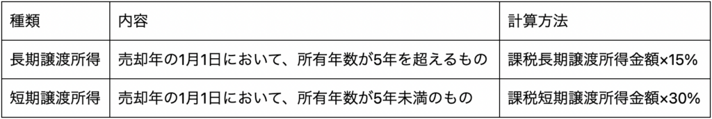 譲渡所得には、長期譲渡所得と短期譲渡所得があり、それぞれ譲渡所得税の計算方法が異なります。